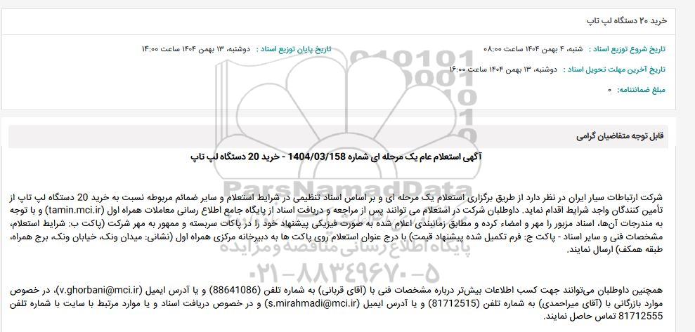 شرکت ارتباطات سیار ایران در نظر دارد از طریق برگزاری استعلام یک مرحله ای و بر اساس اسناد تنظیمی در شرایط استعلام و سایر ضمائم مربوطه نسبت به خرید 20 دستگاه لپ تاپ از تأمین کنندگان واجد شرایط اقدام نماید. داوطلبان شرکت در استعلام می توانند پس از مراجعه و دریافت اسناد از پایگاه جامع اطلاع رسانی معاملات همراه اول (tamin.mci.ir) و با توجه به مندرجات آنها، اسناد مزبور را مهر و امضاء کرده و مطابق زمانبندی اعلام شده به صورت فیزیکی پیشنهاد خود را در پاکات سربسته و ممهور به مهر شرکت (پاکت ب: شرایط استعلام، مشخصات فنی و سایر اسناد - پاکت ج: فرم تکمیل شده پیشنهاد قیمت) با درج عنوان استعلام روی پاکت ها به دبیرخانه مرکزی همراه اول (نشانی: میدان ونک، خیابان ونک، برج همراه، طبقه همکف) ارسال نمایند.