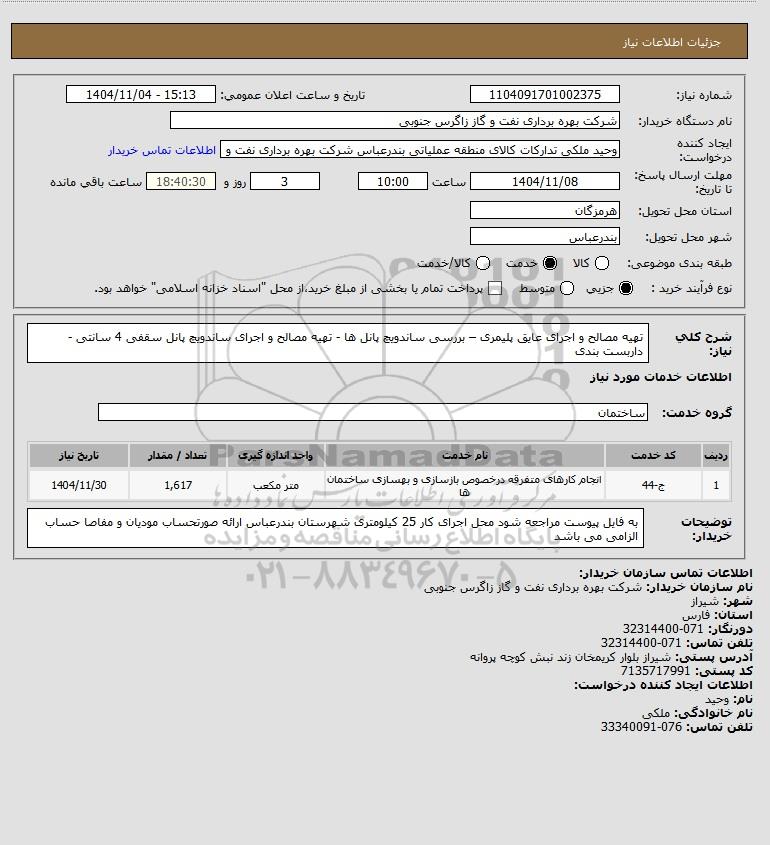 شرح کلی نیاز: تهیه مصالح و اجرای عایق پلیمری – بررسی ساندویچ پانل ها - تهیه مصالح و اجرای ساندویچ پانل سقفی 4 سانتی - داربست بندی