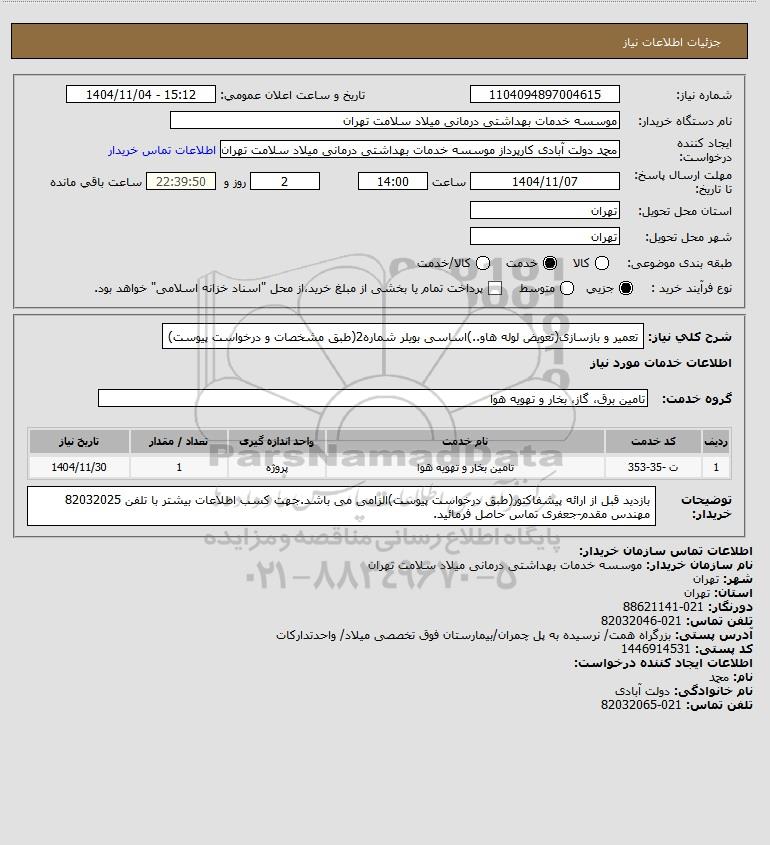 استعلام بها و موضوع استعلام استعلام تعمیر و بازسازی(تعویض لوله هاو..)اساسی بویلر شماره2(طبق مشخصات و درخواست پیوست) به اطلاع کلیه شرکتها و افراد متخصص واجد شرایط میرساند، آگهی گذار در نظر دارد از طریق استعلام بها، نسبت به انتخاب و دریافت پیشنهادات اقدام نماید. این استعلام با کد آگهی ثبت شده در سامانه خبرگزاری پارس نماد : 10182222 منتشر شده است. مشخصات استعلام : تاریخ شروع استعلام: 1404/11/04 آخرین مهلت ارسال پیشنهاد قیمت : 1404/11/07 و محل اجرای پروژه : استان مناقصات استان تهران میباشد. استعلام قیمت مورد درخواست : استعلام تعمیر و بازسازی(تعویض لوله هاو..)اساسی بویلر شماره2(طبق مشخصات و درخواست پیوست) با دستهبندیهای تخصصی و گروه های مرتبط : تاسیسات ساختمانی, صنایع حرارتی و برودتی, دیگ بخار, استعلام اطلاع رسانی میگردد.