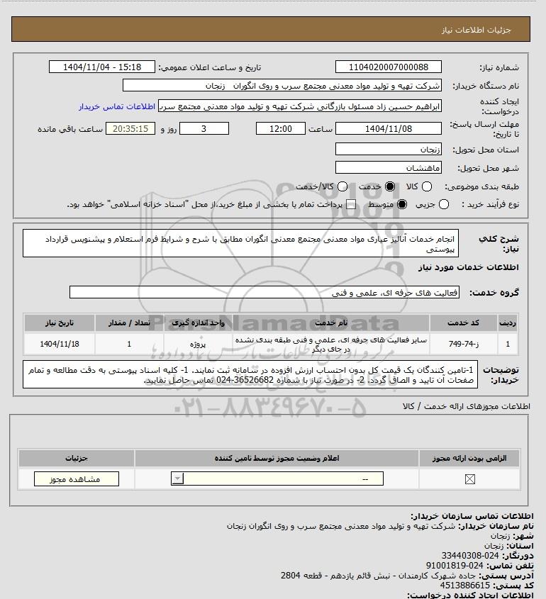 شرح کلی نیاز: انجام خدمات آنالیز عیاری مواد معدنی مجتمع معدنی انگوران مطابق با شرح و شرایط فرم استعلام و پیشنویس قرارداد پیوستی