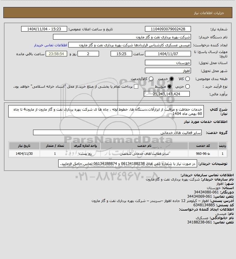 شرح کلی نیاز: خدمات حفاظت و مراقبت از ابزارآلات،دستگاه ها، خطوط لوله ، چاه ها ی شرکت بهره برداری نفت و گاز مارون از مارون4 تا چاه 60 بهمن ماه 1404