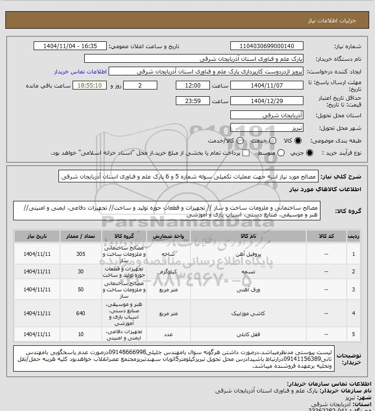 شرح کلی نیاز: مصالح مورد نیاز ابنیه جهت عملیات تکمیلی سوله شماره 5 و 6 پارک علم و فناوری استان آذربایجان شرقی