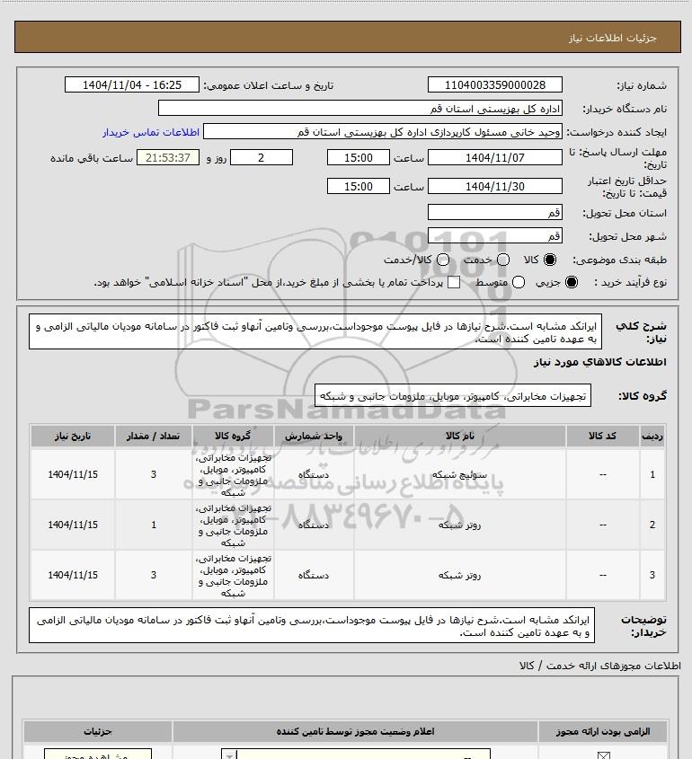 شرح کلی نیاز: ایرانکد مشابه است.شرح نیازها در فایل پیوست موجوداست،بررسی وتامین آنهاو ثبت فاکتور در سامانه مودیان مالیاتی الزامی و به عهده تامین کننده است.