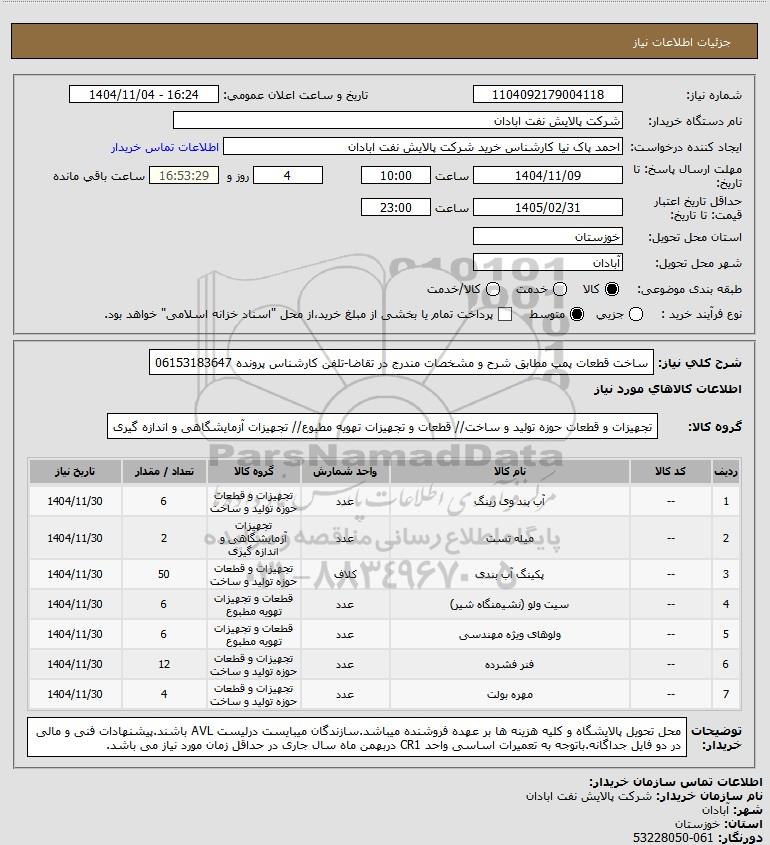 شرح کلی نیاز: ساخت قطعات پمپ مطابق شرح و مشخصات مندرج در تقاضا-تلفن کارشناس پرونده 06153183647