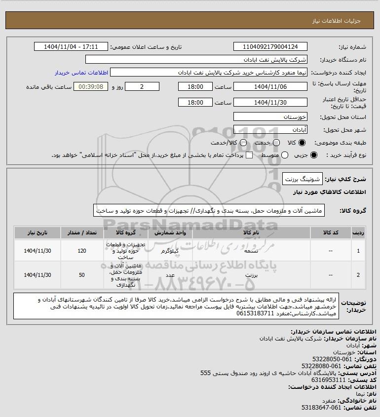 نام سازمان خریدار: شرکت پالایش نفت ابادان