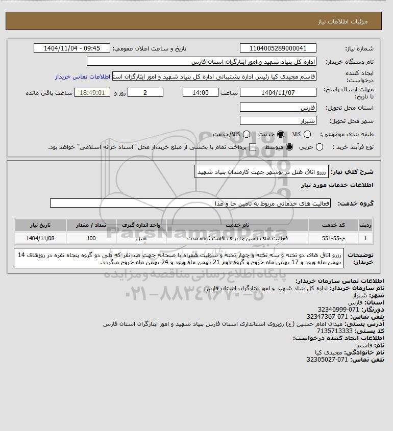 استعلام رزرو اتاق هتل در بوشهر جهت کارمندان بنیاد شهید, استعلام رزرو اتاق هتل در بوشهر جهت کارمندان بنیاد شهید
