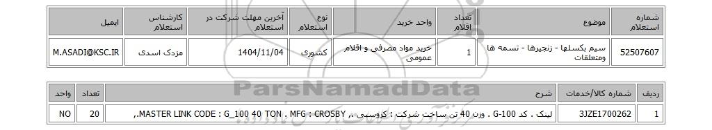 52507607سیم بکسلها - زنجیرها - تسمه ها ومتعلقات1خرید مواد مصرفی و اقلام عمومیکشوری1404/11/04مزدک اسدیM.ASADI@KSC.IR