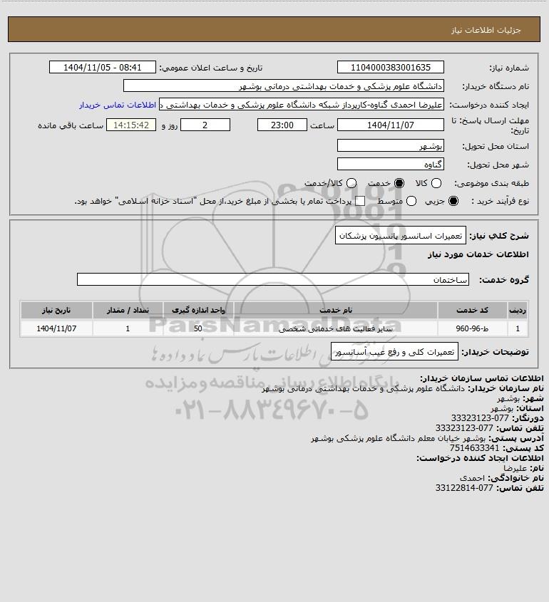 شرح کلی نیاز: تعمیرات اسانسور پانسیون پزشکان