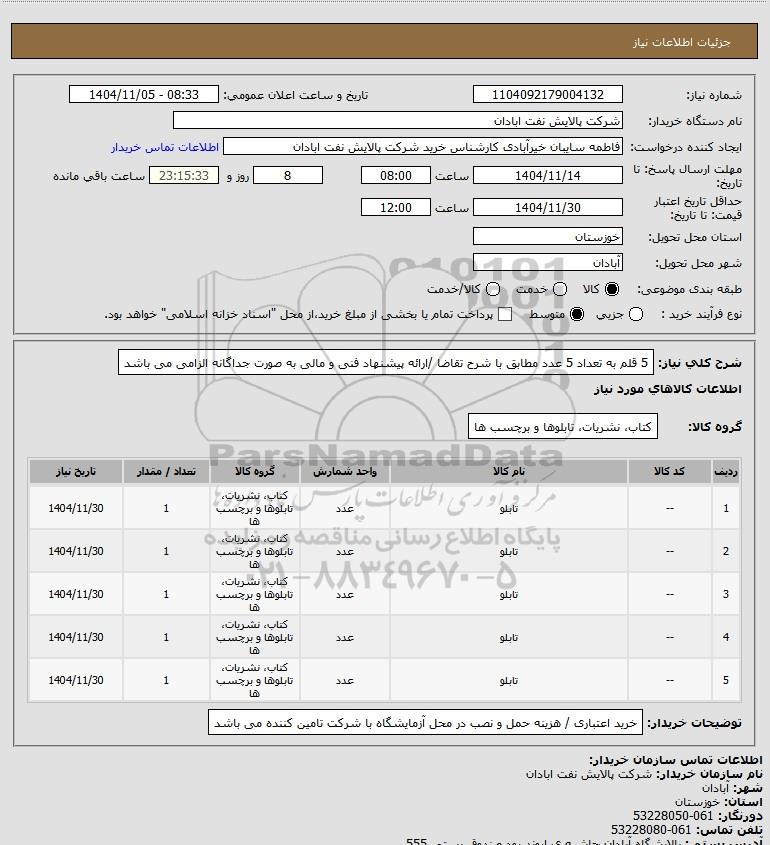 استعلام بها و موضوع استعلام استعلام 5 قلم به تعداد 5 عدد مطابق با شرح تقاضا /ارائه پیشنهاد فنی و مالی به صورت جداگانه الزامی می باشد به اطلاع کلیه شرکتها و افراد متخصص واجد شرایط میرساند، آگهی گذار در نظر دارد از طریق استعلام بها، نسبت به انتخاب و دریافت پیشنهادات اقدام نماید. این استعلام با کد آگهی ثبت شده در سامانه خبرگزاری پارس نماد : 10184356 منتشر شده است. مشخصات استعلام : تاریخ شروع استعلام: 1404/11/05 آخرین مهلت ارسال پیشنهاد قیمت : 1404/11/14 و محل اجرای پروژه : استان مناقصات استان خوزستان میباشد. استعلام قیمت مورد درخواست : استعلام 5 قلم به تعداد 5 عدد مطابق با شرح تقاضا /ارائه پیشنهاد فنی و مالی به صورت جداگانه الزامی می باشد با دستهبندیهای تخصصی و گروه های مرتبط : طراحی چاپ و تبلیغات, استعلام اطلاع رسانی میگردد.