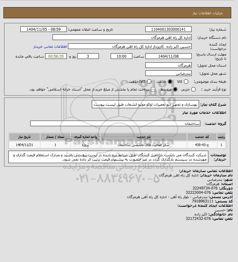 شرح کلی نیاز: بهسازی و تجهیز دپو تعمیرات لوکو موتیو انشعاب طبق لیست پیوست