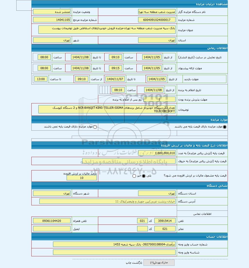 | عنوان مزایده | بانک سپه مدیریت شعب منطقه سه تهران-مزایده فروش خودپردازهای اسقاطی طبق توضیحات پیوست | |||