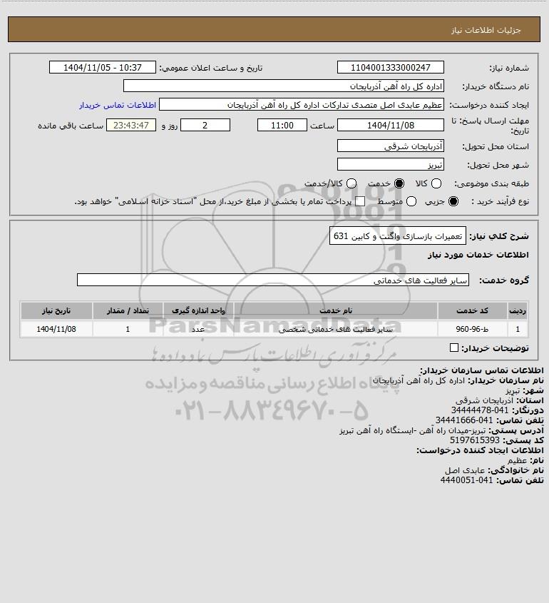 شرح کلی نیاز: تعمیرات بازسازی واگنت و کابین 631