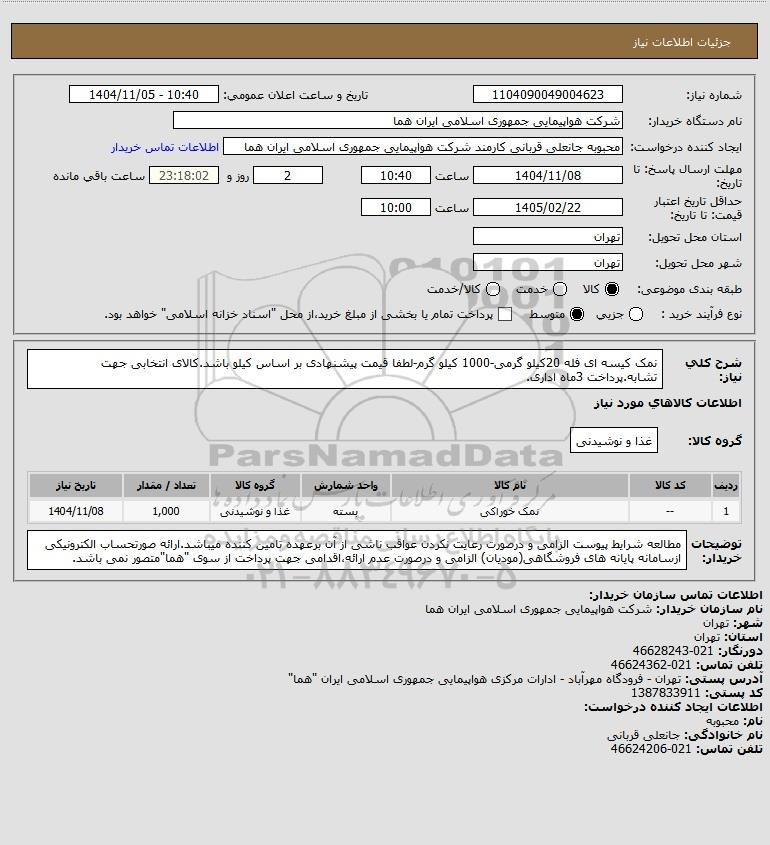 استعلام بها و موضوع استعلام استعلام نمک کیسه ای فله 20کیلو گرمی-1000 کیلو گرم-لطفا قیمت پیشنهادی بر اساس کیلو باشد.کالای انتخابی جهت تشابه.پرداخت 3ماه اداری. به اطلاع کلیه شرکت‌ها و افراد متخصص واجد شرایط می‌رساند، آگهی گذار در نظر دارد از طریق استعلام بها، نسبت به انتخاب و دریافت پیشنهادات اقدام نماید. این استعلام با کد آگهی ثبت شده در سامانه خبرگزاری پارس نماد : 10185795 منتشر شده است. مشخصات استعلام : تاریخ شروع استعلام: 1404/11/05 آخرین مهلت ارسال پیشنهاد قیمت : 1404/11/08 و محل اجرای پروژه : استان مناقصات استان تهران میباشد. استعلام قیمت مورد درخواست : استعلام نمک کیسه ای فله 20کیلو گرمی-1000 کیلو گرم-لطفا قیمت پیشنهادی بر اساس کیلو باشد.کالای انتخابی جهت تشابه.پرداخت 3ماه اداری. با دسته‌بندی‌های تخصصی و گروه های مرتبط : مواد غذایی, نمک, استعلام اطلاع رسانی میگردد.