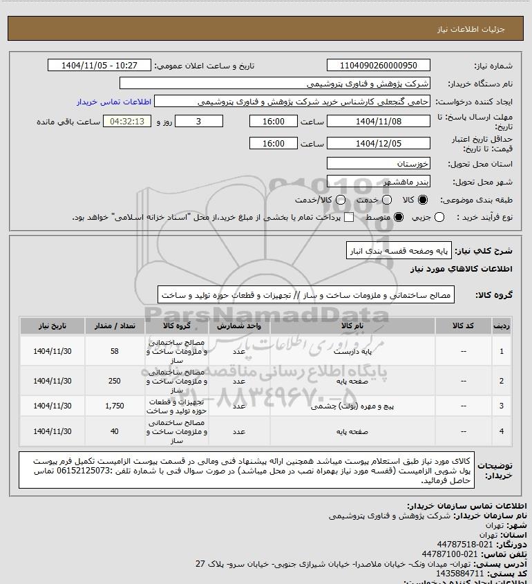 شرح کلی نیاز: پایه وصفحه قفسه بندی انبار