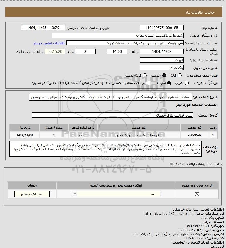 شرح کلی نیاز: عملیات استقرار یک واحد آزمایشگاهی محلی جهت انجام خدمات آزمایشگاهی پروژه های عمرانی سطح شهر