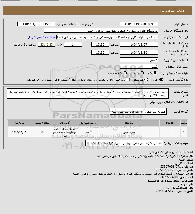 استعلام بها و موضوع استعلام استعلام خرید درب اتاقی طبق لیست پیوستی هزینه حمل ونقل وبارگیری ونصب به عهده فروشنده می باشد پرداخت بعد از تایید وتحویل به مدت 20روز کاری به اطلاع کلیه شرکت‌ها و افراد متخصص واجد شرایط می‌رساند، آگهی گذار در نظر دارد از طریق استعلام بها، نسبت به انتخاب و دریافت پیشنهادات اقدام نماید. این استعلام با کد آگهی ثبت شده در سامانه خبرگزاری پارس نماد : 10186920 منتشر شده است. مشخصات استعلام : تاریخ شروع استعلام: 1404/11/05 آخرین مهلت ارسال پیشنهاد قیمت : 1404/11/07 و محل اجرای پروژه : استان مناقصات استان فارس میباشد. استعلام قیمت مورد درخواست : استعلام خرید درب اتاقی طبق لیست پیوستی هزینه حمل ونقل وبارگیری ونصب به عهده فروشنده می باشد پرداخت بعد از تایید وتحویل به مدت 20روز کاری با دسته‌بندی‌های تخصصی و گروه های مرتبط : انواع در و پنجره, مصالح ساختمانی, مصنوعات چوبی و مبلمان اداری, استعلام اطلاع رسانی میگردد.