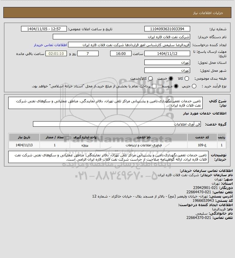 شرح کلی نیاز: تامین خدمات تعمیر،نگهداری،تامین و پشتیبانی مراکز تلفن تهران، دفاتر نمایندگی، مناطق عملیاتی و سکوهای نفتی