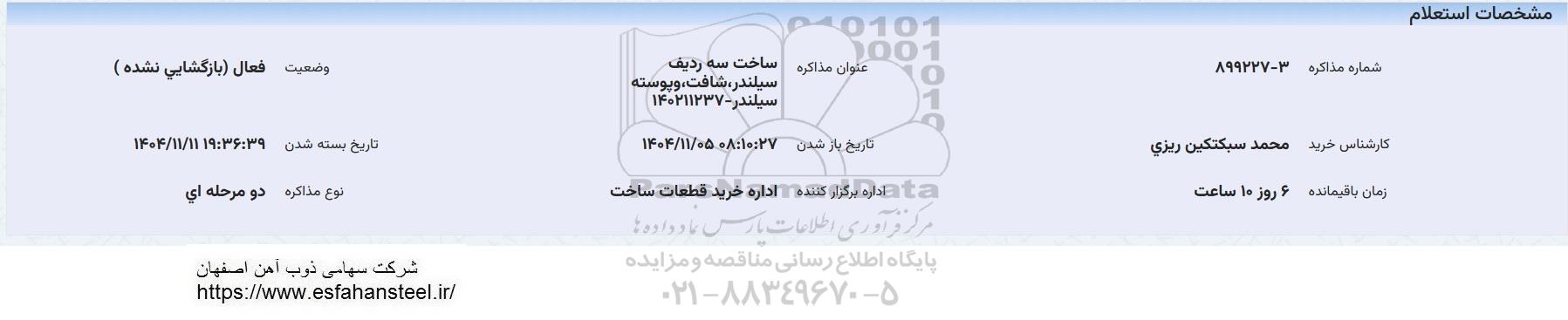 عنوان مذاکره :  استعلام ساخت سه ردیف سیلندر، شاف و پوسته سیلندر- 140211237