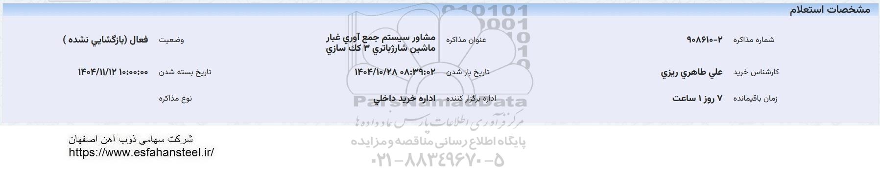 استعلام مشاور سیستم جمع آوری غبار ماشین شارژ باتری 3 کک سازی, استعلام مشاور سیستم جمع آوری غبار ماشین شارژ باتری 3 کک سازی