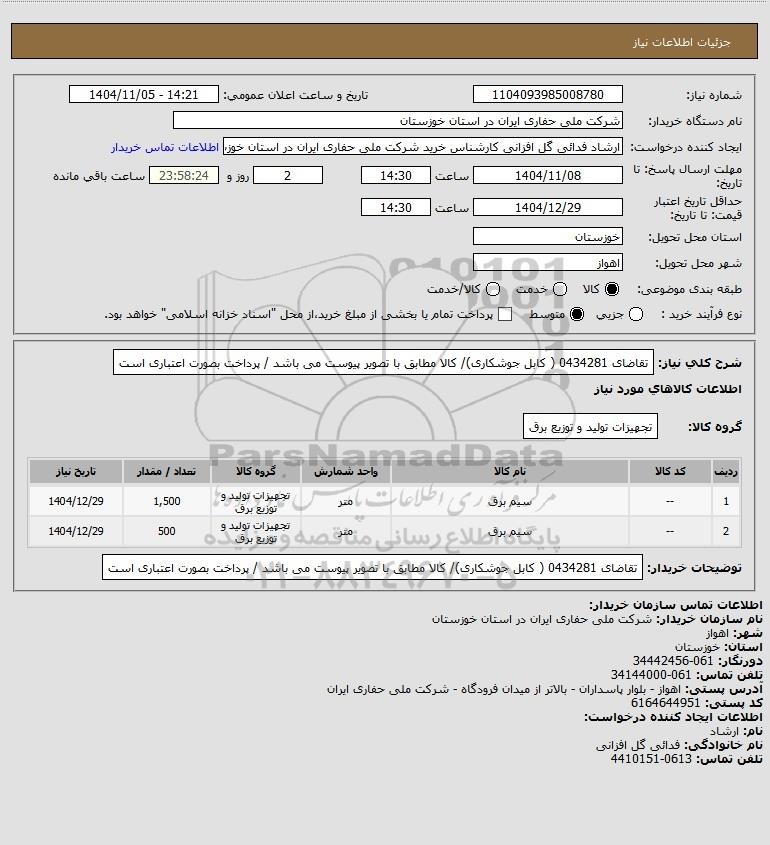 شرح کلی نیاز: تقاضای 0434281 ( کابل جوشکاری)/ کالا مطابق با تصویر پیوست می باشد / پرداخت بصورت اعتباری است