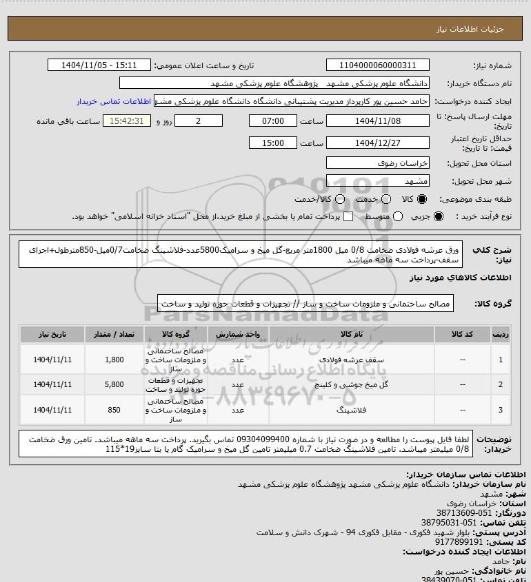 شرح کلی نیاز: ورق عرشه فولادی ضخامت 0/8 میل 1800متر مربع-گل میخ و سرامیک5800عدد-فلاشینگ ضخامت0/7میل-850مترطول+اجرای سقف-پرداخت سه ماهه میباشد