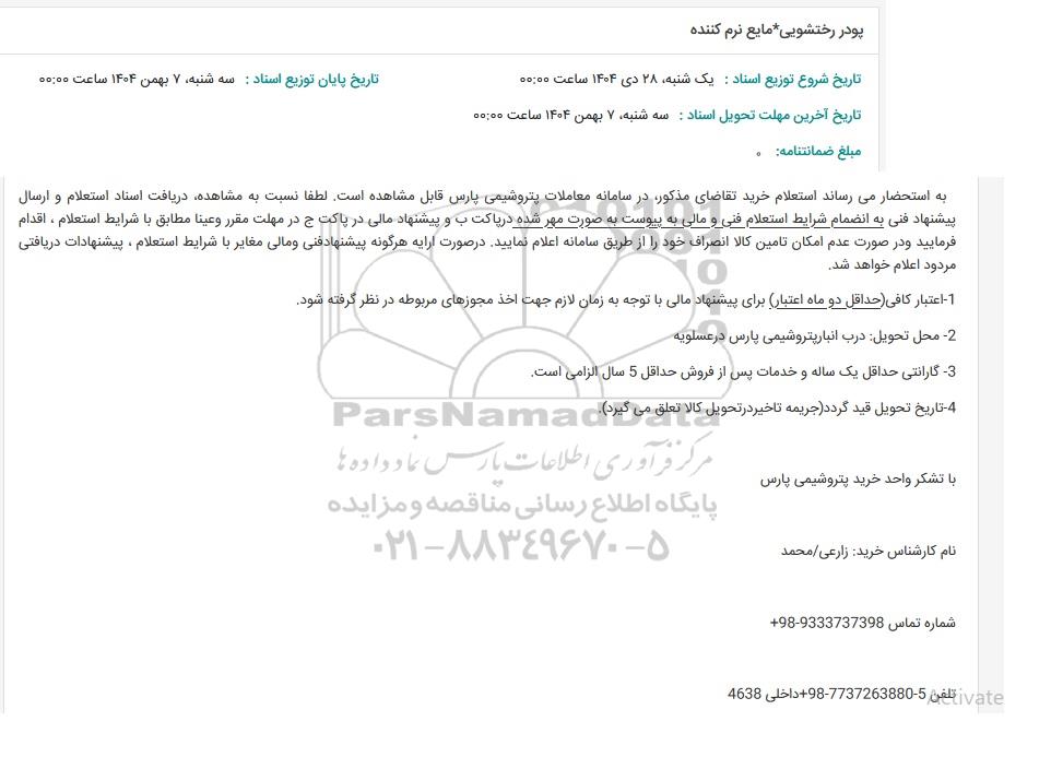 به استحضار می رساند استعلام خرید تقاضای مذکور در سامانه معاملات پتروشیمی پارس قابل مشاهده است. لطفا نسبت به مشاهده دریافت اسناد استعلام و ارسال پیشنهاد فنی به انضمام شرایط استعلام فنی و مالی به پیوست به صورت مهر شده در پاکت ب و پیشنهاد مالی در پاکت ج در مهلت مقرر وعينا مطابق با شرایط استعلام ، اقدام فرمایید و در صورت عدم امکان تامین کالا انصراف خود را از طریق سامانه اعلام نمایید. در صورت ارایه هرگونه پیشنهادفنی و مالی مغایر با شرایط استعلام ، پیشنهادات دریافتی مردود اعلام خواهد شد.
