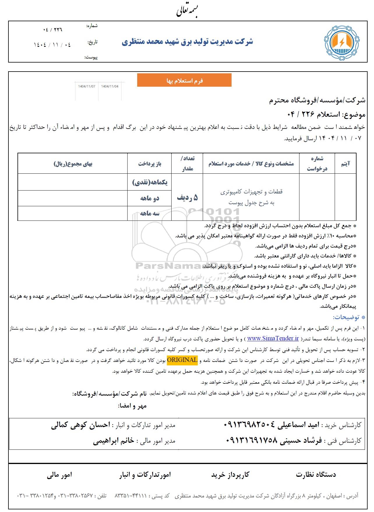 | قطعات و تجهیزات کامپیوتری به شرح جدول پیوست | 5 ردیف | یکماهه (نقدی) دوماهه سه ماهه |