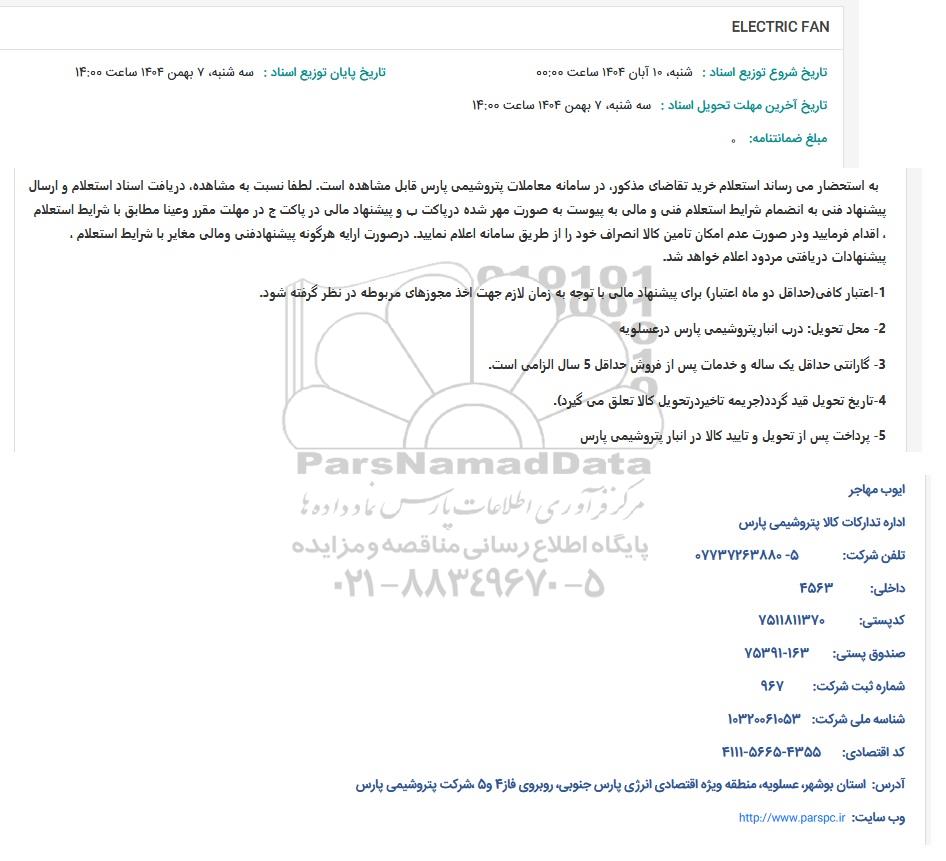 به استحضار می رساند استعلام خرید تقاضای مذکور در سامانه معاملات پتروشیمی پارس قابل مشاهده است. لطفا نسبت به مشاهده دریافت استاد استعلام و ارسال پیشنهاد فنی به انضمام شرایط استعلام فنی و مالی به پیوست به صورت مهر شده در پاکت ب و پیشنهاد مالی در پاکت ج در مهلت مقرر و عینا مطابق با شرایط استعلام اقدام فرمایید و در صورت عدم امکان تامین کالا انصراف خود را از طریق سامانه اعلام نمایید در صورت ارایه هرگونه پیشنها دفتی و مالی مغایر با شرایط استعلام . پیشنهادات دریافتی مردود اعلام خواهد شد.