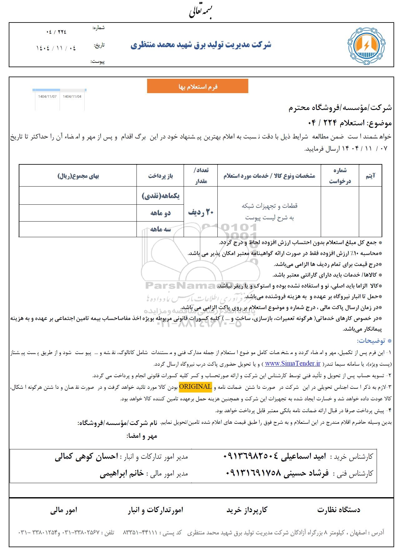 | قطعات و تجهیزات شبکه به شرح پیوست | 20 ردیف |