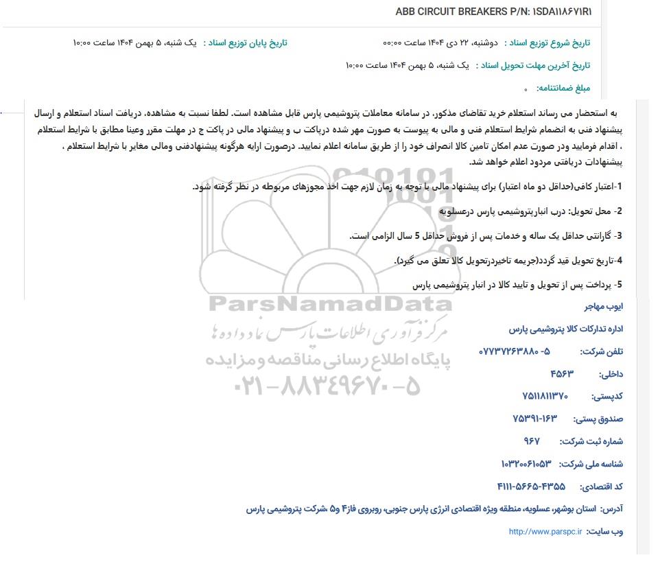 به استحضار میرساند استعلام خرید تقاضای مذکور در سامانه معاملات پتروشیمی پارس قابل مشاهده است. لطفا نسبت به مشاهده دریافت اسناد استعلام و ارسال پیشنهاد فنی به انضمام شرایط استعلام فنی و مالی به پیوست به صورت مهر شده در پاکت ب و پیشنهاد مالی در پاکت ج در مهلت مقرر وعينا مطابق با شرایط استعلام اقدام فرمایید و در صورت عدم امکان تامین کالا انصراف خود را از طریق سامانه اعلام نمایید. در صورت ارایه هرگونه پیشنها دفنی و مالی مغایر با شرایط استعلام پیشنهادات دریافتی مردود اعلام خواهد شد.