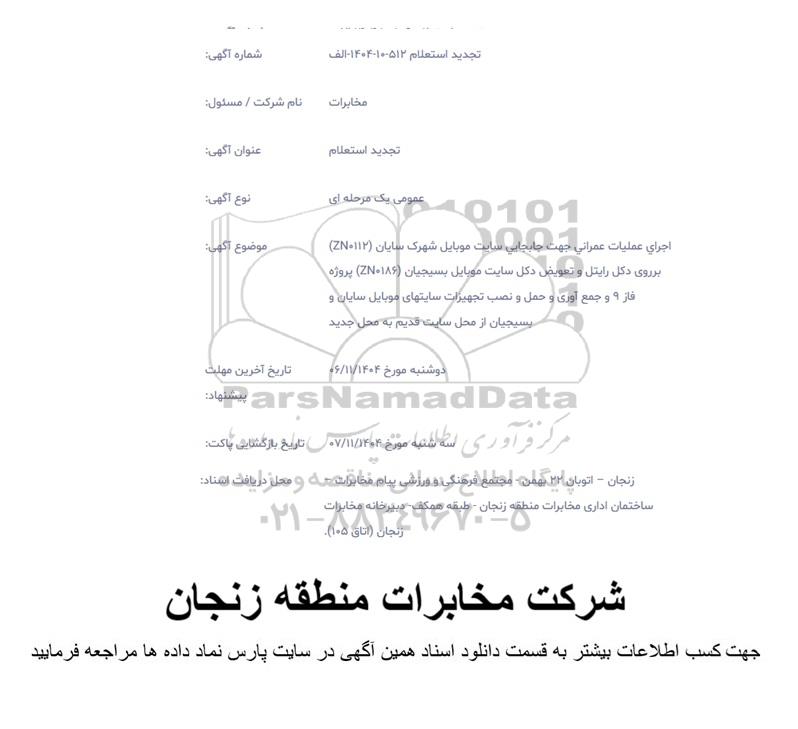 موضوع آگهی: اجرای عملیات عمرانی جهت جابجایی سایت موبایل شهرک سایان (ZN0112) بر روی دکل رایتل و تعویض دکل سایت موبایل بسیجیان (ZN0186) پروژه فاز 9 و جمع آوری و حمل و نصب تجهیزات سایتهای موبایل سایان و بسیجیان از محل سایت قدیم به محل جدید