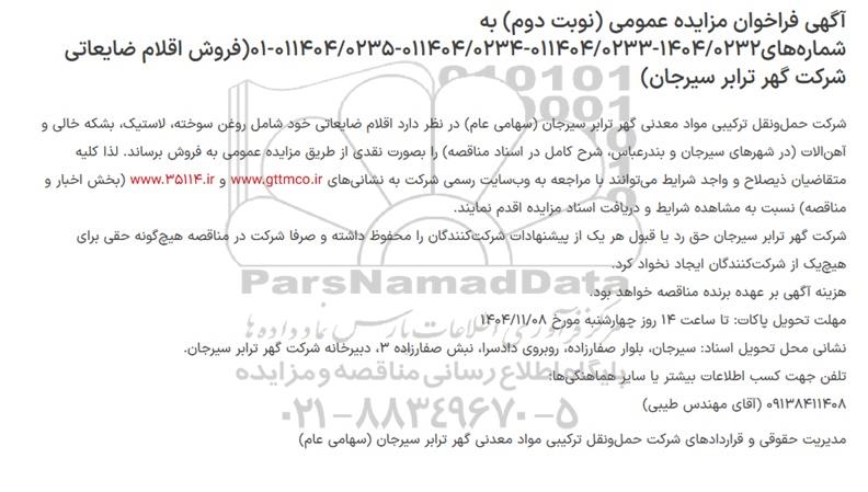 شرکت حمل و نقل ترکیبی مواد معدنی گهر ترابر سیرجان (سهامی عام) در نظر دارد اقلام ضایعاتی خود شامل روغن سوخته، لاستیک، بشکه خالی و آهن آلات (در شهرهای سیرجان و بندر عباس، شرح کامل در اسناد مناقصه) را بصورت نقدی از طریق مزایده عمومی به فروش برساند. لذا کلیه متقاضیان ذیصلاح و واجد شرایط می توانند با مراجعه به وب سایت رسمی شرکت به نشانی های www.gttmco.ir و www.35114.ir (بخش اخبار و مناقصه) نسبت به مشاهده شرایط و دریافت اسناد مزایده اقدم نمایند.