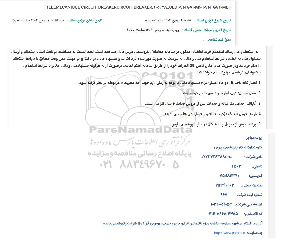استعلام بها و موضوع استعلام استعلام TELEMECANIQUE CIRCUIT BREAKERCIRCUIT BREAKER, 4-6.38., OLD P/N GVI-MI P/N: G72-ME10 به اطلاع کلیه شرکتها و افراد متخصص واجد شرایط میرساند، آگهی گذار در نظر دارد از طریق استعلام بها، نسبت به انتخاب و دریافت پیشنهادات اقدام نماید. این استعلام با کد آگهی ثبت شده در سامانه خبرگزاری پارس نماد : 10188605 منتشر شده است. مشخصات استعلام : تاریخ شروع استعلام: 1404/11/05 آخرین مهلت ارسال پیشنهاد قیمت : 1404/11/07 و محل اجرای پروژه : استان مناقصات استان بوشهر میباشد. استعلام قیمت مورد درخواست : استعلام TELEMECANIQUE CIRCUIT BREAKERCIRCUIT BREAKER, 4-6.38., OLD P/N GVI-MI P/N: G72-ME10 با دستهبندیهای تخصصی و گروه های مرتبط : انواع کلید و پریزهای برقی و صنعتی, تجهیزات نفت و گاز, تجهیزات برق و الکترونیک, استعلام اطلاع رسانی میگردد.