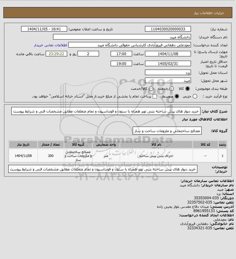 | 1 | -- | اجزای بتنی پیش ساخته | متر | مصالح ساختمانی و ملزومات ساخت و ساز | 200 | 1404/11/08 |