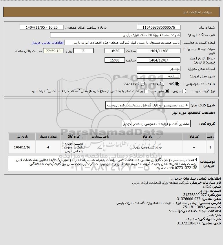 شرح کلی نیاز: 4 عدد دیسپنسر دو نازل گازوئیل مشخصات فنی پیوست