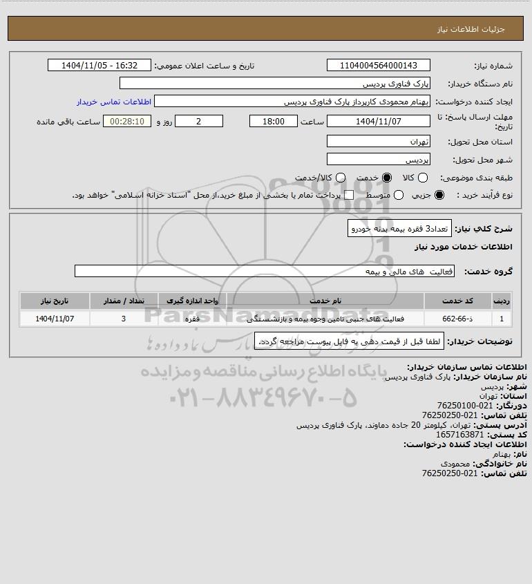شرح کلی نیاز: تعداد3 فقره بیمه بدنه خودرو