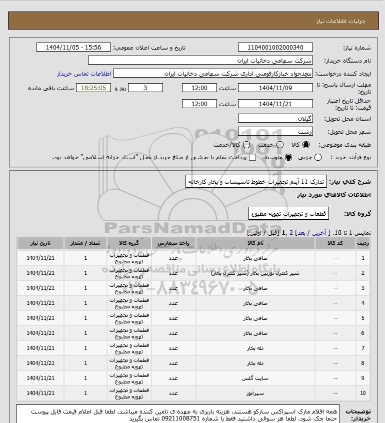 شرح کلی نیاز: تدارک 11 آیتم تجهیزات خطوط تاسیسات و بخار کارخانه