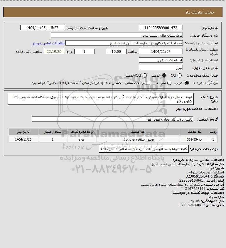 شرح کلی نیاز: تهیه ، حمل ، راه اندازی اینورتر 37 کیلو وات سنگین کار و تنظیم مجدد پارامترها و بازسازی تابلو برق دستگاه لباسشویی 150 کیلویی فوژ