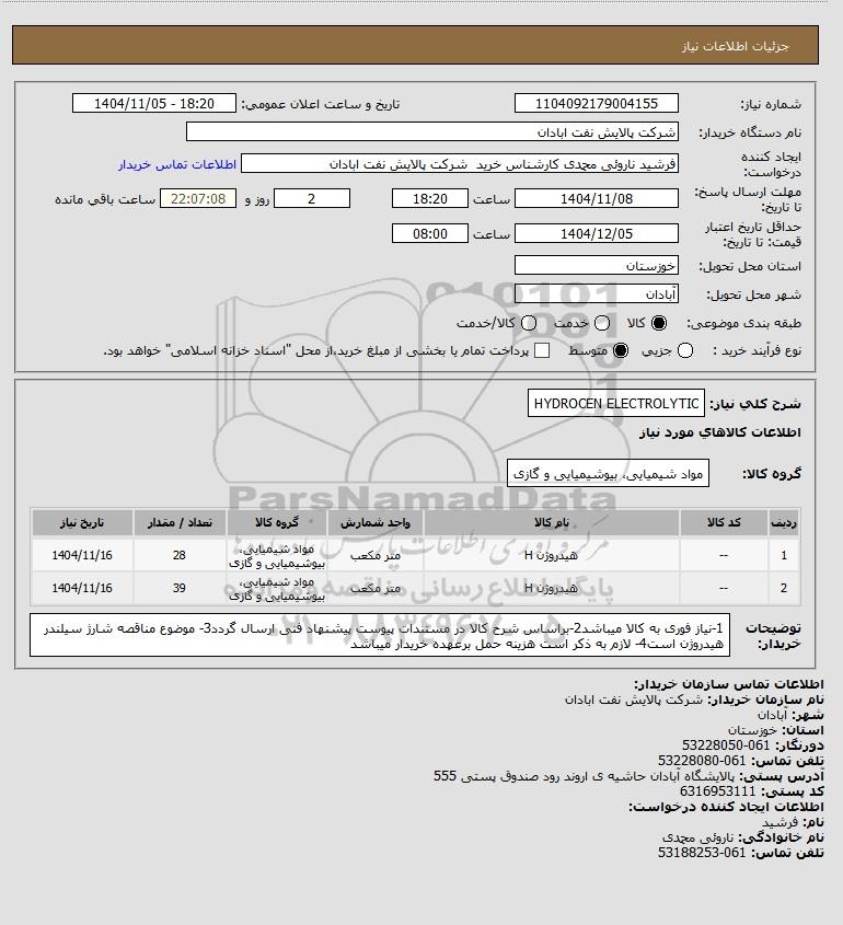 شرح کلی نیاز: HYDROCEN ELECTROLYTIC