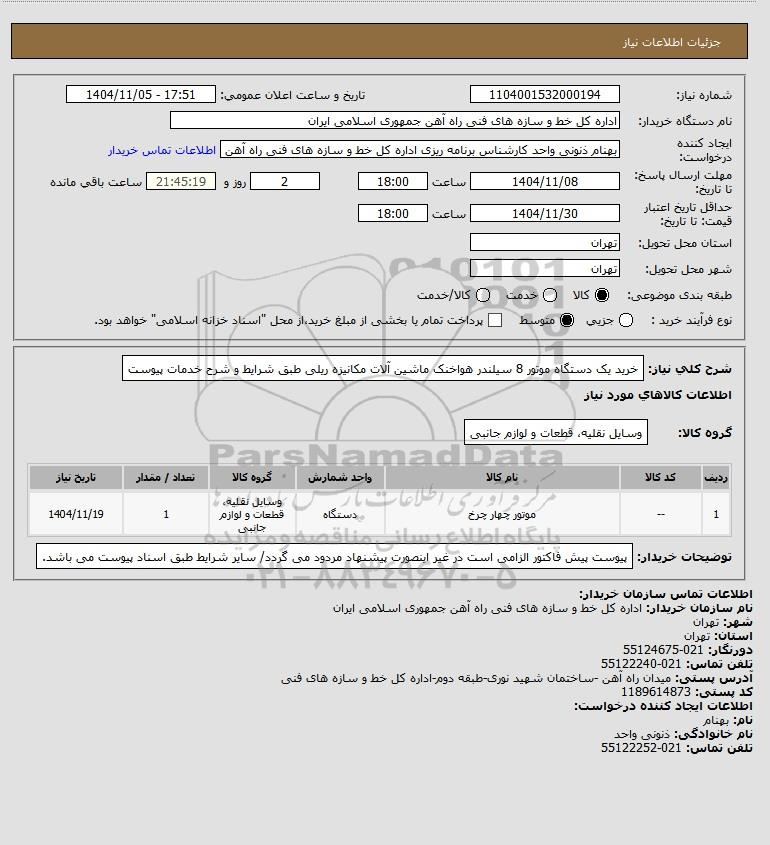 شرح کلی نیاز: خرید یک دستگاه موتور 8 سیلندر هواخنک ماشین آلات مکانیزه ریلی طبق شرایط و شرح خدمات پیوست