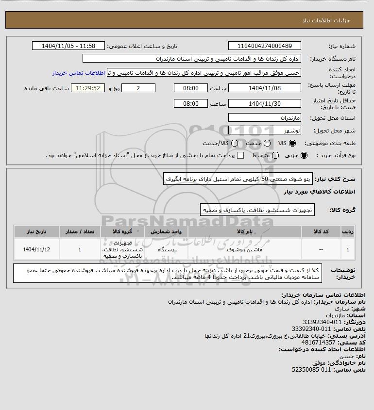 شرح کلی نیاز: پتو شوی صنعتی 50 کیلویی تمام استیل دارای برنامه ابگیری