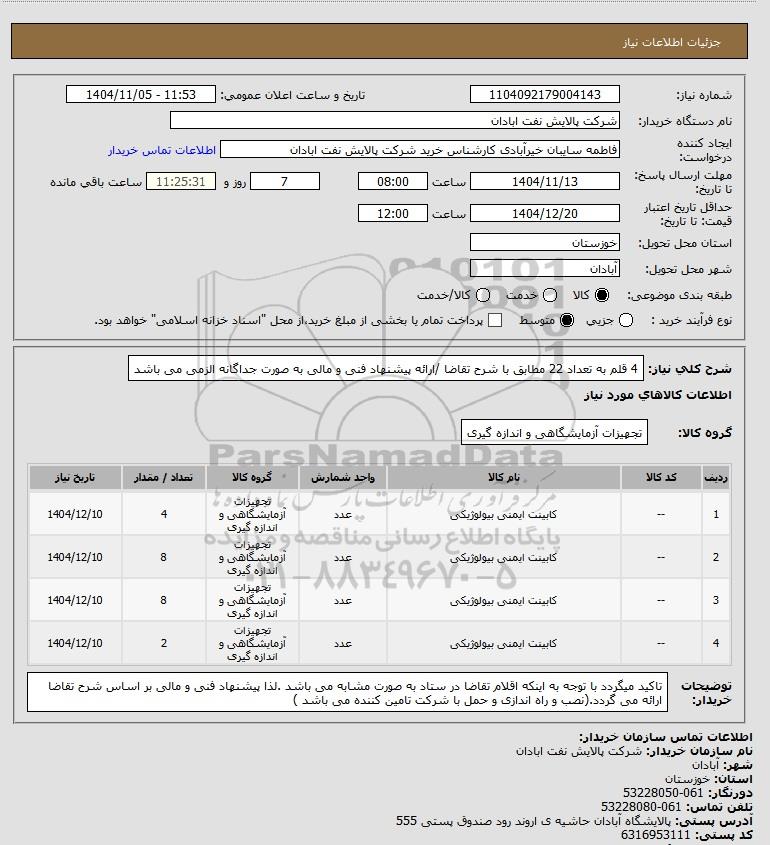 استعلام بها و موضوع استعلام استعلام 4 قلم به تعداد 22 مطابق با شرح تقاضا /ارائه پیشنهاد فنی و مالی به صورت جداگانه الزمی می باشد به اطلاع کلیه شرکتها و افراد متخصص واجد شرایط میرساند، آگهی گذار در نظر دارد از طریق استعلام بها، نسبت به انتخاب و دریافت پیشنهادات اقدام نماید. این استعلام با کد آگهی ثبت شده در سامانه خبرگزاری پارس نماد : 10189292 منتشر شده است. مشخصات استعلام : تاریخ شروع استعلام: 1404/11/05 آخرین مهلت ارسال پیشنهاد قیمت : 1404/11/13 و محل اجرای پروژه : استان مناقصات استان خوزستان میباشد. استعلام قیمت مورد درخواست : استعلام 4 قلم به تعداد 22 مطابق با شرح تقاضا /ارائه پیشنهاد فنی و مالی به صورت جداگانه الزمی می باشد با دستهبندیهای تخصصی و گروه های مرتبط : خدمات و تجهیزات آزمایشگاهی و پزشکی, سیستم ایمنی ، اتش نشانی،اعلام و اطفای حریق, کابینت, مصنوعات چوبی و مبلمان اداری, تجهیزات نفت و گاز, استعلام اطلاع رسانی میگردد.