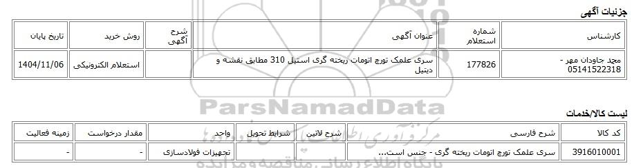 محمد جاودان مهر - 05141522318177826سری علمک تورچ اتومات ریخته گری استیل 310 مطابق نقشه و دیتیلاستعلام الکترونیکی1404/11/06