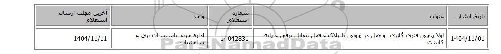 1404/11/01لولا ‎پیچی‏ ‎فنری گازری‏ ‎ و قفل ‎در چوبی‏ ‎با پلاک و قفل ‎مقابل برقی‏ و پایه ‎کابینت‏14042831اداره خرید تاسیسات برق و ساختمان1404/11/11