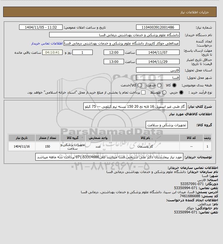 شرح کلی نیاز: گاز طبی غیر استریل 16 لایه نخ 20 150 بسته نیم کیلویی --- 75 کیلو