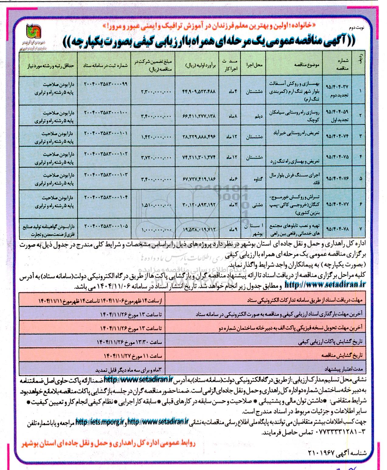 اداره کل راهداری و حمل و نقل جاده ای استان بوشهر در نظر دارد پروژه های ذیل را براساس مشخصات و شرایط کلی مندرج در جدول ذیل به صورت برگزاری مناقصه عمومی یک مرحله ای همراه با ارزیابی کیفی (بصورت یکپارچه) به پیمانکاران واجد شرایط واگذار نماید.