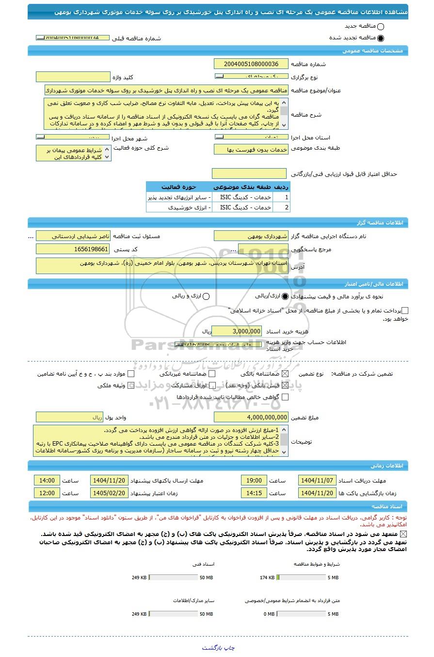 | عنوان/موضوع مناقصه | مناقصه عمومی یک مرحله ای نصب و راه اندازی پنل خورشیدی بر روی سوله خدمات موتوری شهرداری بومهن | |||||||||||