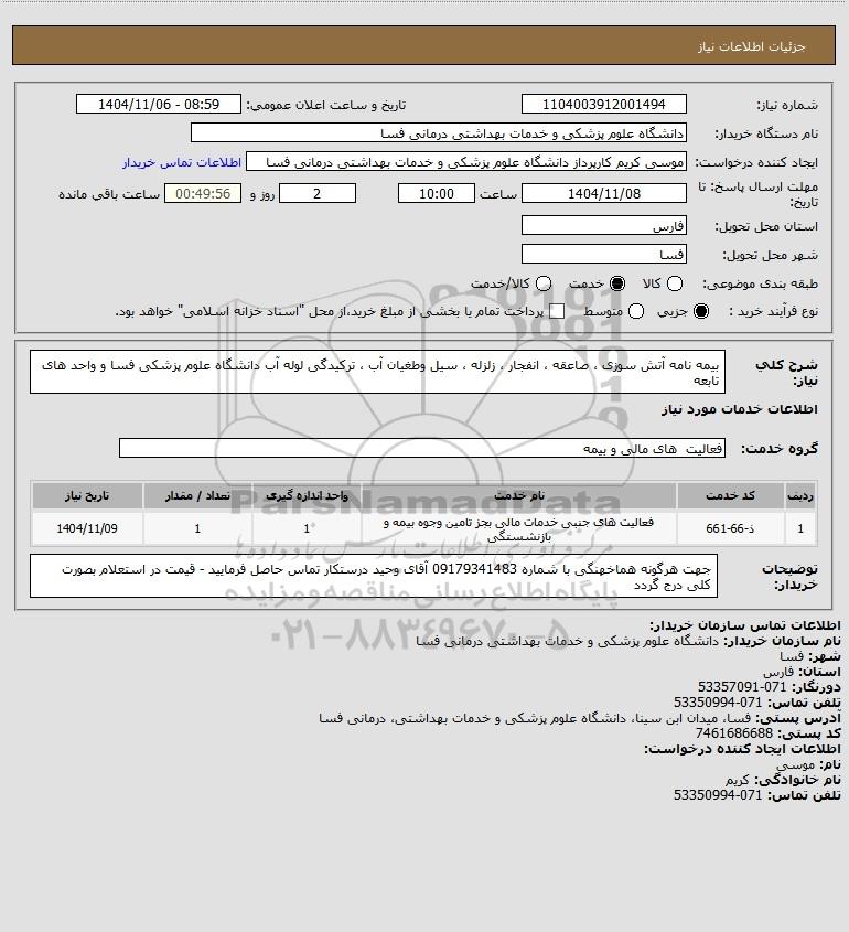 شرح کلی نیاز: بیمه نامه آتش سوزی ، صاعقه ، انفجار ، زلزله ، سیل وطغیان آب ، ترکیدگی لوله آب دانشگاه علوم پزشکی فسا و واحد های تابعه