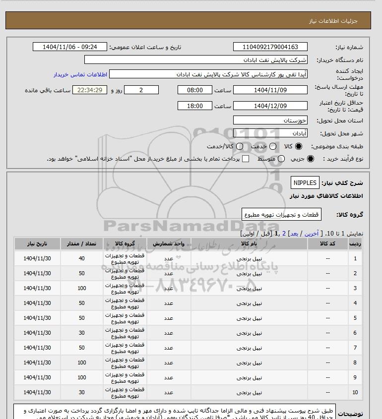 | 9 | -- | نیپل برنجی | عدد | قطعات و تجهیزات تهویه مطبوع | 100 | 1404/11/30 |
