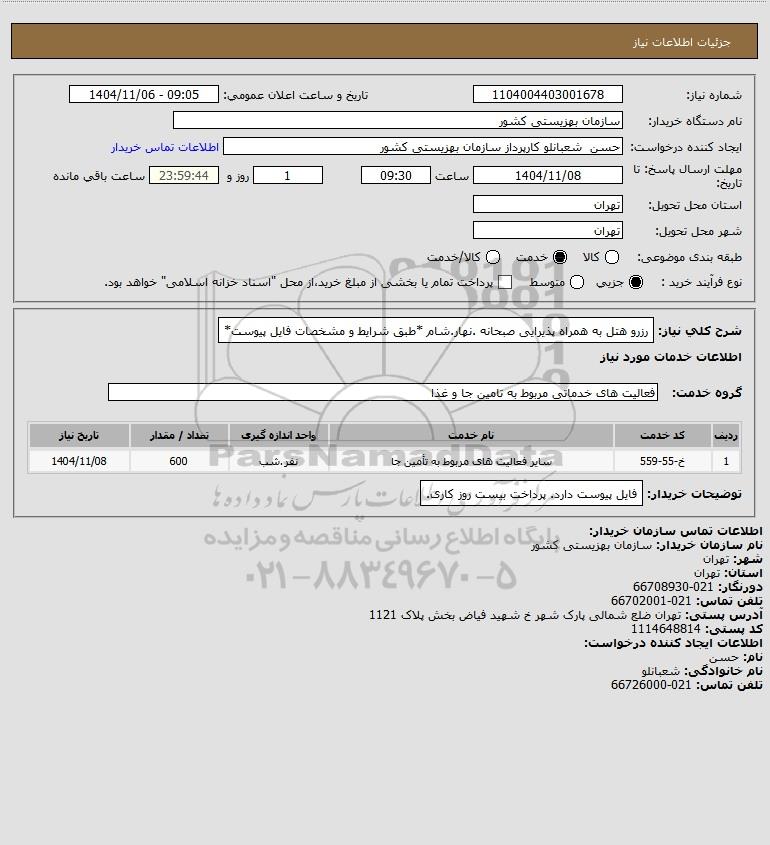 استعلام بها و موضوع استعلام استعلام رزرو هتل به همراه پذیرایی صبحانه .نهار.شام *طبق شرایط و مشخصات فایل پیوست* به اطلاع کلیه شرکتها و افراد متخصص واجد شرایط میرساند، آگهی گذار در نظر دارد از طریق استعلام بها، نسبت به انتخاب و دریافت پیشنهادات اقدام نماید. این استعلام با کد آگهی ثبت شده در سامانه خبرگزاری پارس نماد : 10191976 منتشر شده است. مشخصات استعلام : تاریخ شروع استعلام: 1404/11/06 آخرین مهلت ارسال پیشنهاد قیمت : 1404/11/08 و محل اجرای پروژه : استان مناقصات استان تهران میباشد. استعلام قیمت مورد درخواست : استعلام رزرو هتل به همراه پذیرایی صبحانه .نهار.شام *طبق شرایط و مشخصات فایل پیوست* با دستهبندیهای تخصصی و گروه های مرتبط : طبخ غذا, خدمات رفاهی, استعلام اطلاع رسانی میگردد.